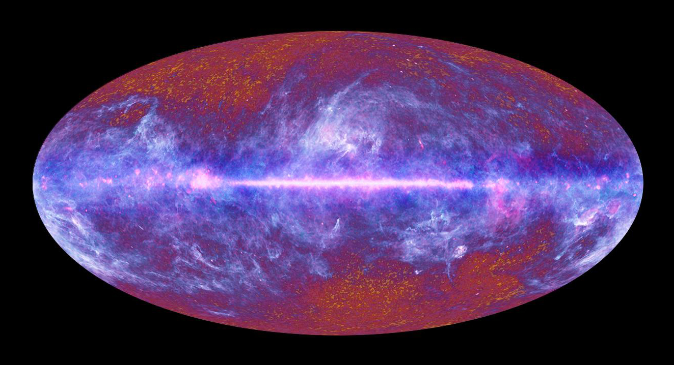 The book covers twenty questions you might want to ask about the Universe, beginning with “What is it?” and going all the way through to asking “If it had a creator”. I didn’t expect Stuart to be able to cover everything in between in an hour and a quarter, but he managed the contents list impressively. Especially when he began by showing this image from the European Space Agency’s (ESA’s) Planck observatory/telescope and saying that here is everything that is, that ever was and that ever will be.